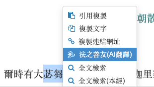 选择您想翻译的文字段落,并通过鼠标右键启动 AI 翻译功能,即可将佛典内容转换为熟悉的现代中文,或翻译成其他外语,也可搜索语义相近的段落。